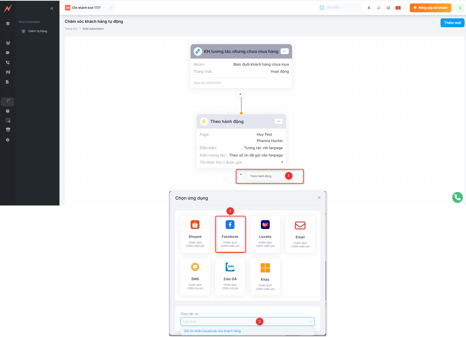 **Note: In this content, we guide you through setting up a task to send messages to customers on the condition that they have interacted with the fanpage.
