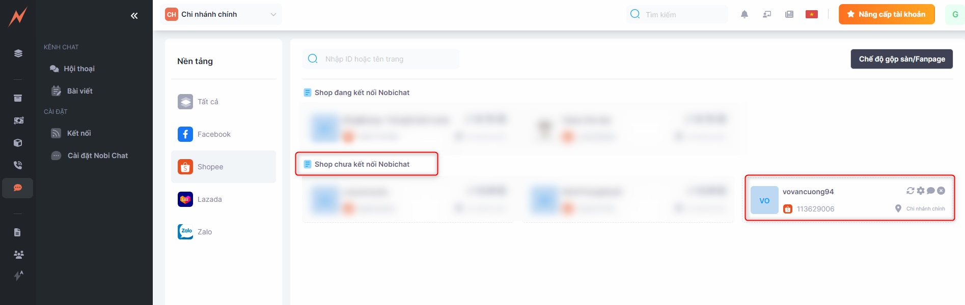 The tab displays a list of TikTok, Shopee, and Lazada accounts that have been connected to Nobi Pro and integrated with Nobi Chat. Here, you have various actions that help you easily link your store with the e-commerce platforms.