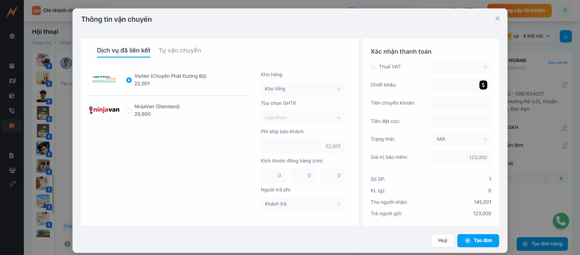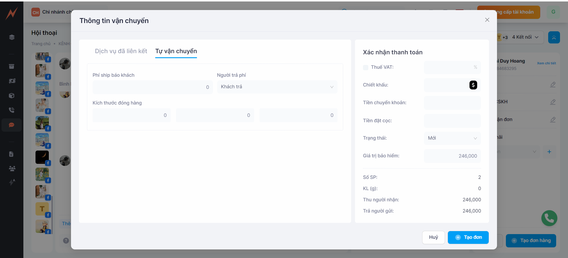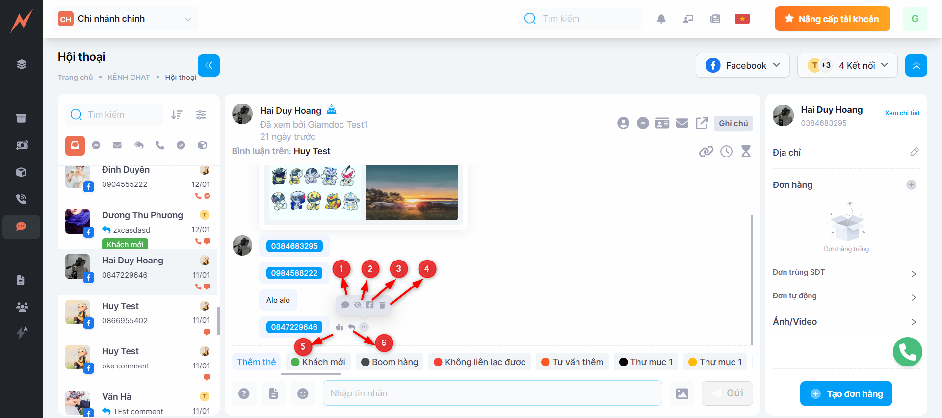 After successfully creating the order, the system will display the conversation details on the screen, showing the newly created order in the order list.