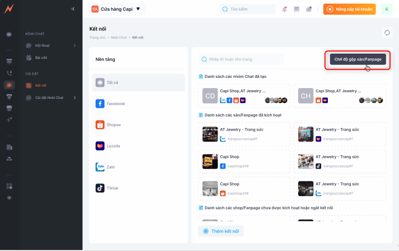 The "Tab all" displays a list of connected Fanpage/Shopee/Lazada/Zalo OA to Nobi Pro and connected to Nobi Chat. Here you can merge different chat channels into one group chat.