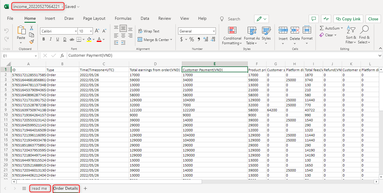 2. The reconciliation file will be named income and within the file there are 2 sheets: read me and sheet order details.