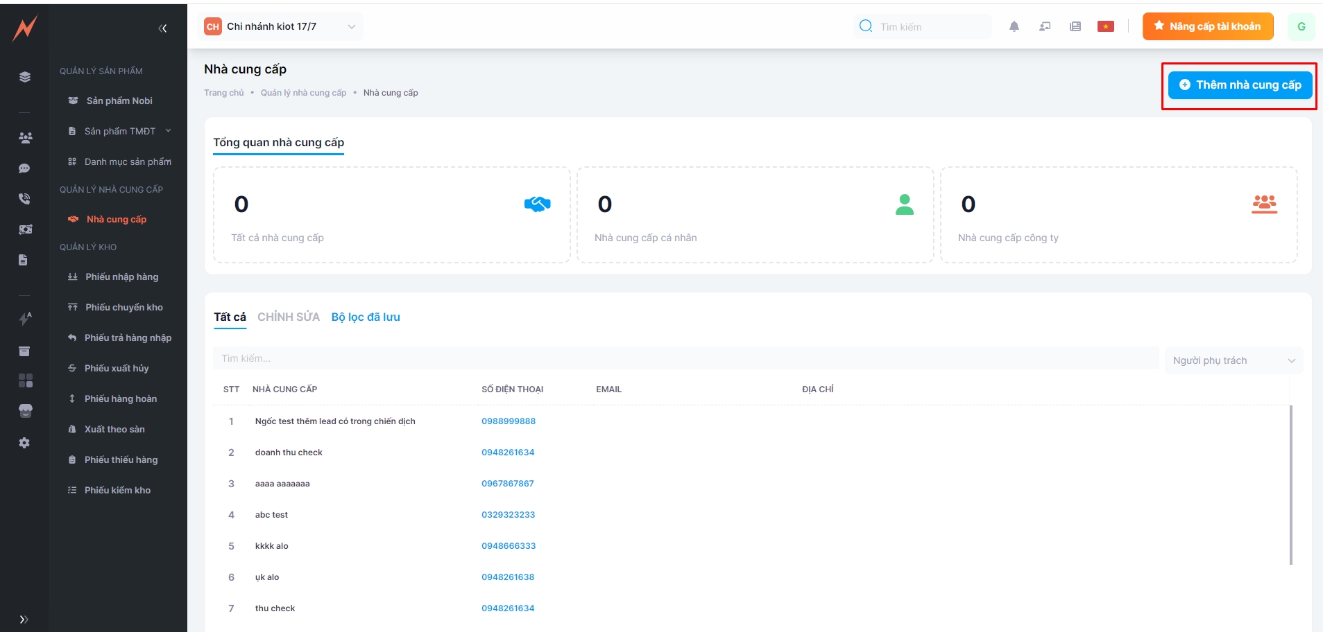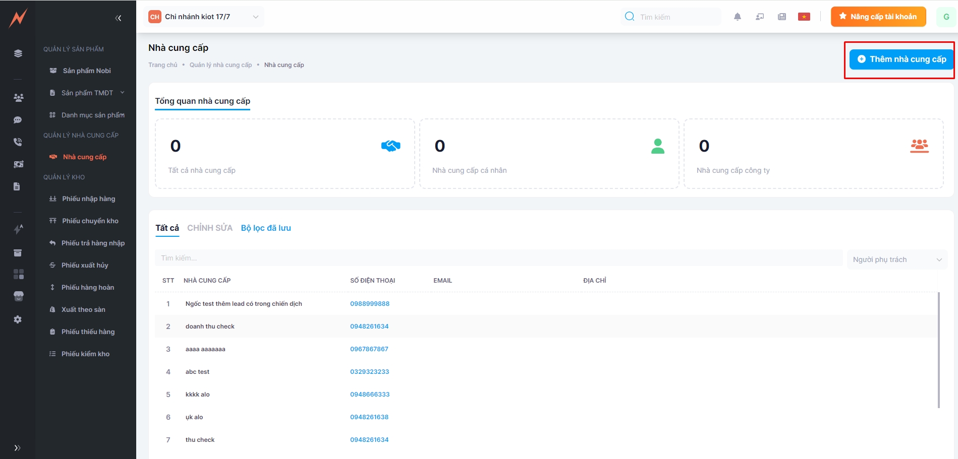 Bước 1: In the supplier list, click on button "Thêm mới nhà cung cấp"