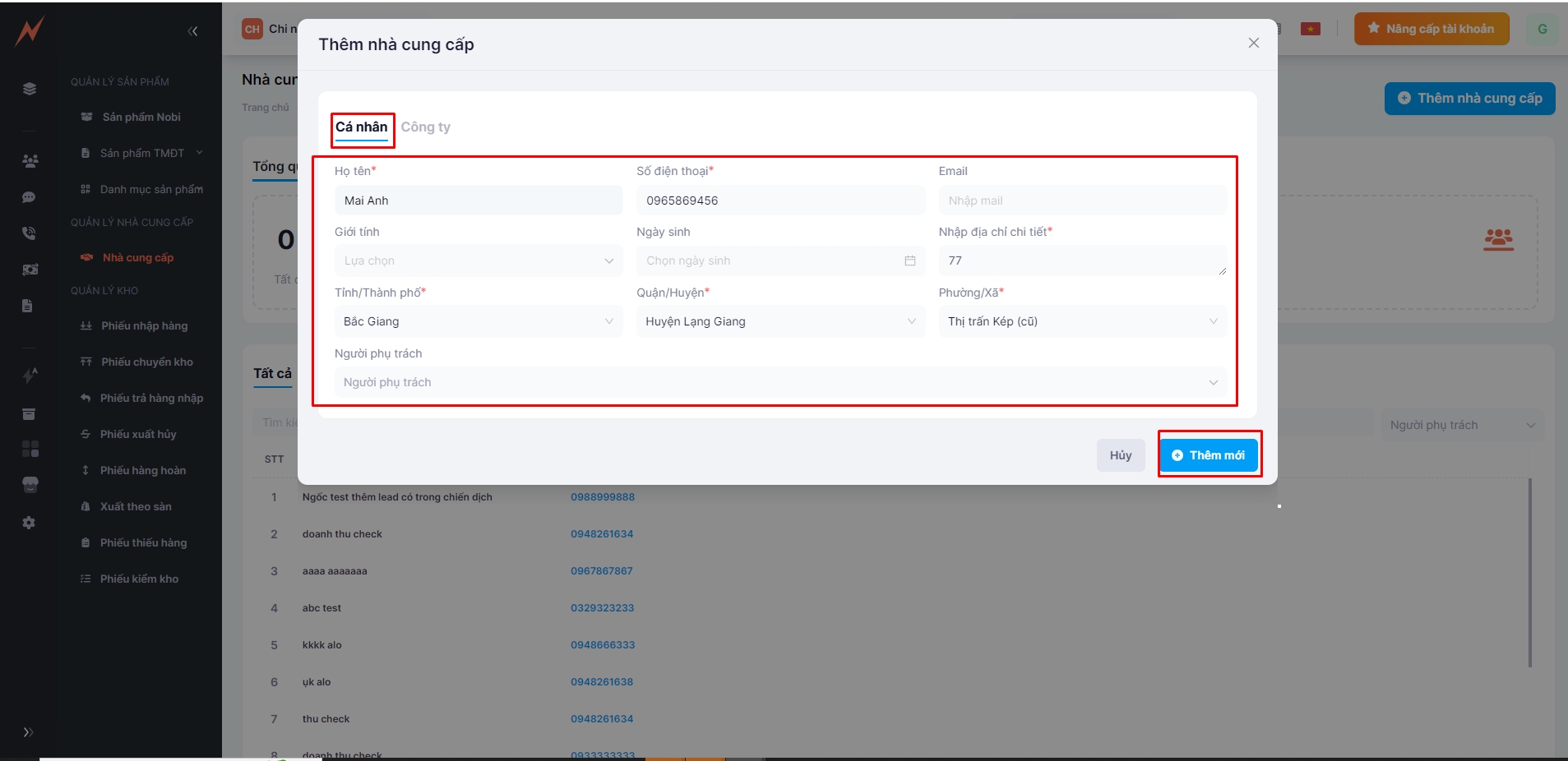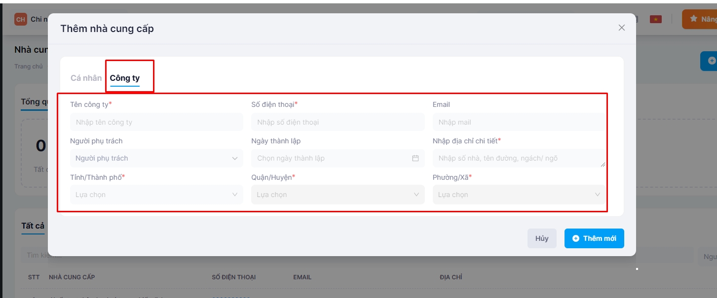 1.1 Thêm mới nhà cung cấp cá nhân