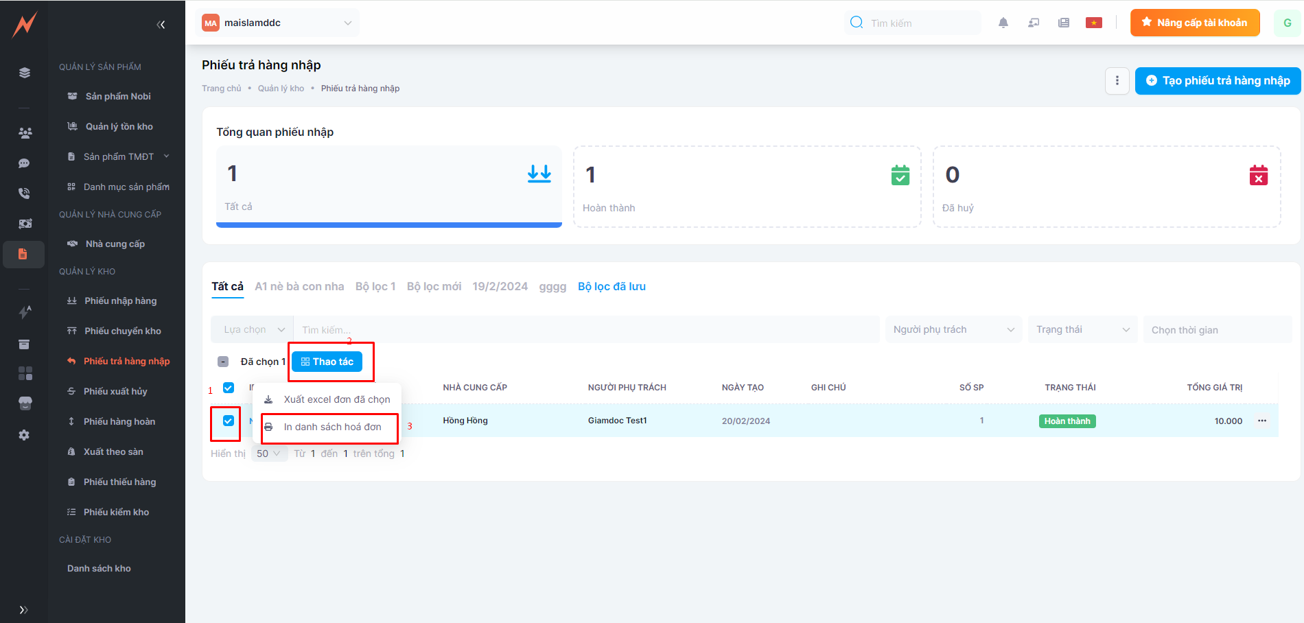 After receiving goods, the situation of defective and damaged goods is unavoidable. For defective products, manufacturer's faults, you have the right to return to the supplier according to the policies and terms in the contract. Therefore, to easily manage the quantity of goods before and after returning, Nobi Pro system integrates the supplier return feature.