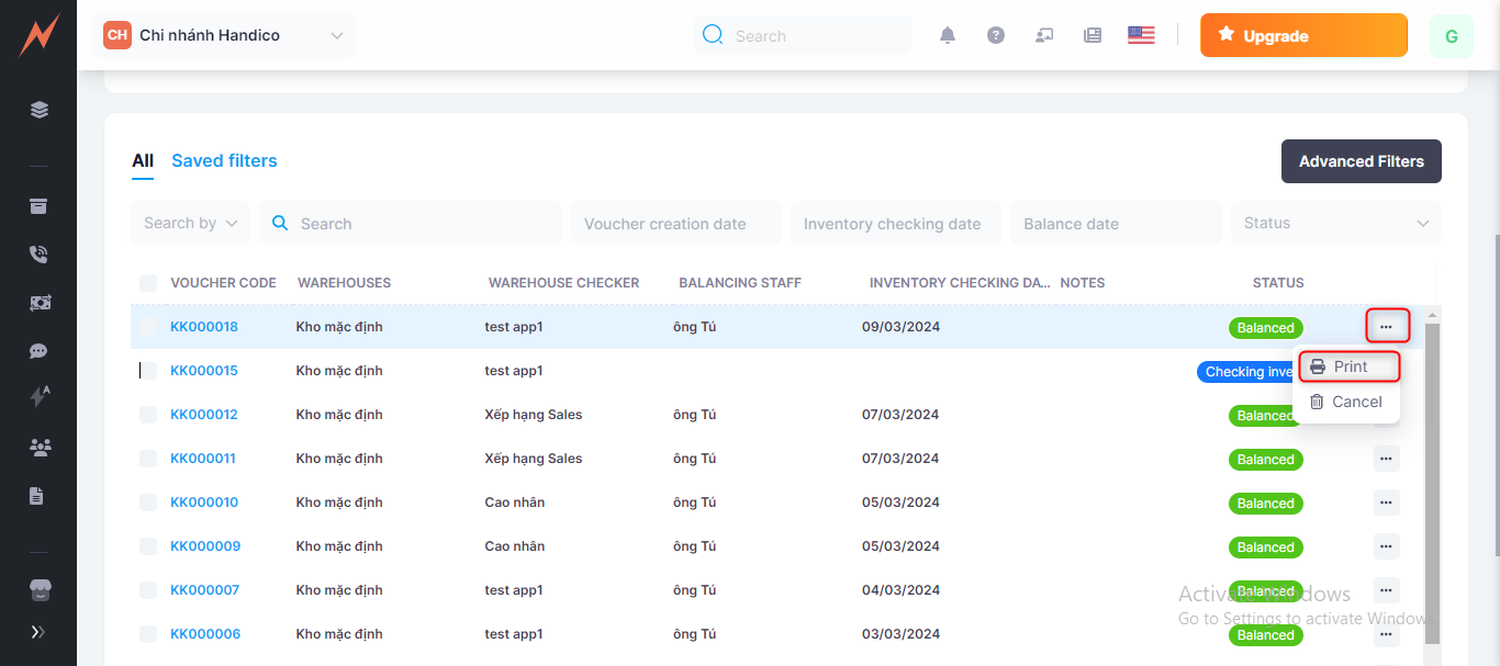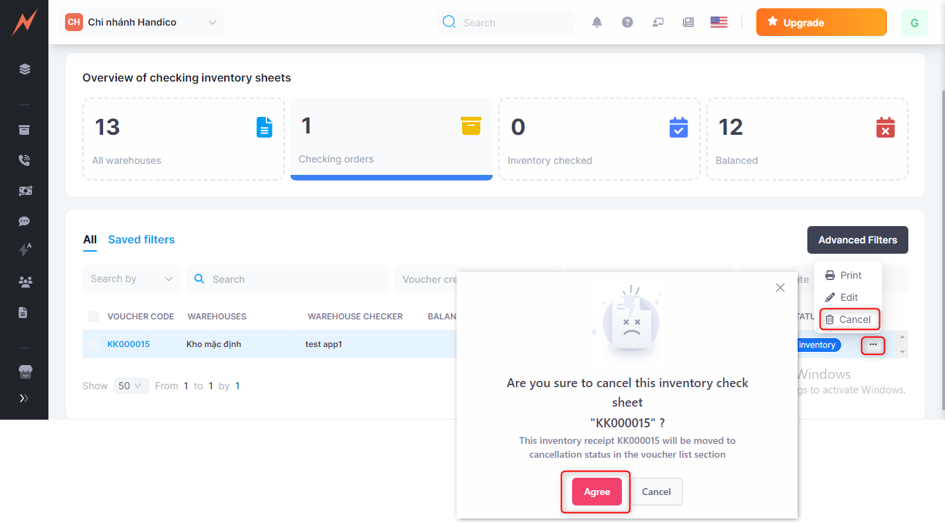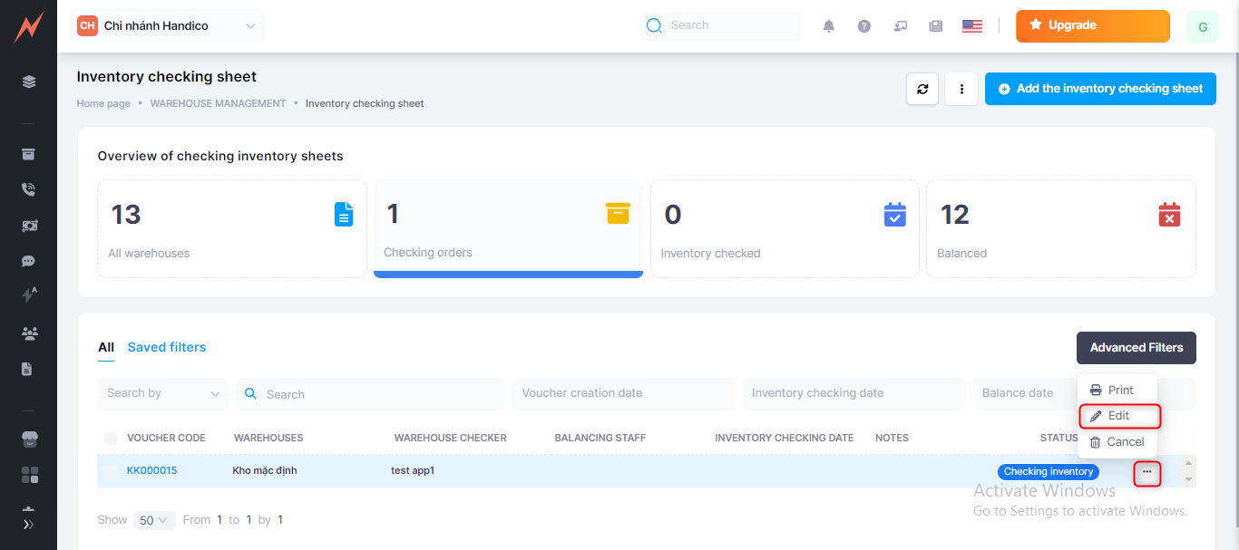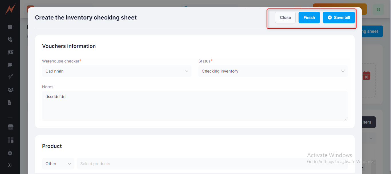 2. Employees assigned to inventory checking will verify the quantity, report the actual quantity in stock to the manager/shop owner (the person who created the voucher), or update the actual quantity in the inventory checking voucher themselves => Inventory checked.