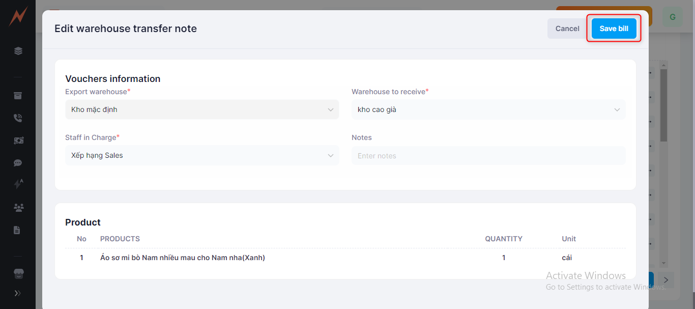 Step 2: At the transfer form, change information and click on button "Save bill"
