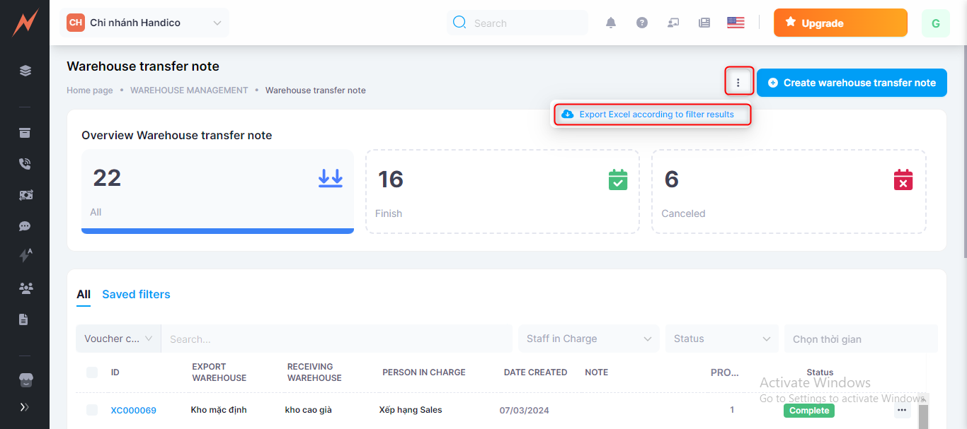 To set up transfer and manage transfer, you go to **Products -> Warehouse transfer note**. The interface will be displayed as shown below.